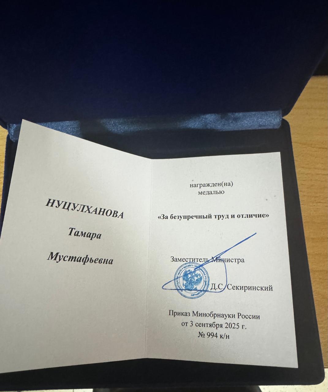 Поздравляем выпускницу 2025 г. магистратуры Промышленная фармация Нуцулханову Тамару Мустафьевну с заслуженной наградой Министерства науки и высшего образования Российской Федерации – медалью «За безупречный труд и отличие».
